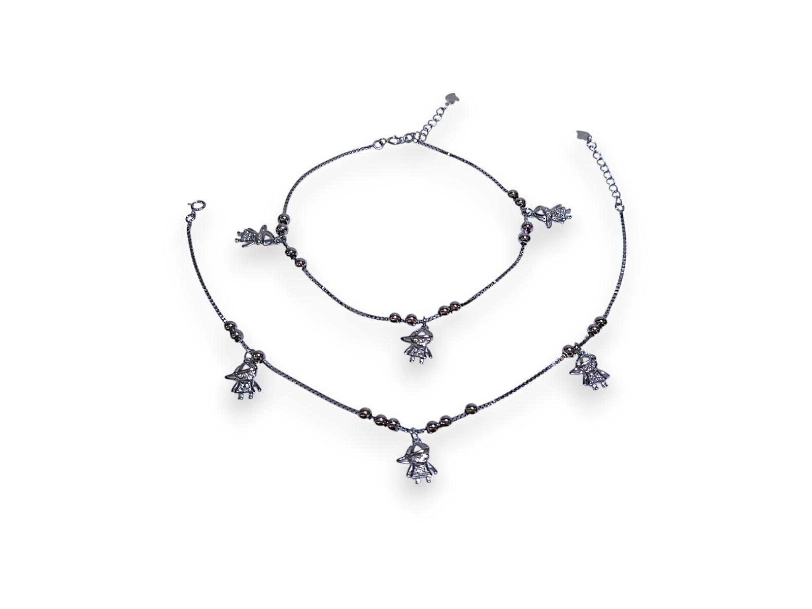 925 sterling designer beaded balls & doll charms silver chain anklets for women. The anklets weighs 11.620 grams. Silver finish with easy to wear spring-ring clasp. Make a delightful addition to your jewellery collection with this pair of beautiful anklets. It is an ideal pick to glam up your casual look. It is suitable for all skin types. Keep it away from perfume, sprays, and water. Preserve your Jewellery in the original box or a soft cloth pouch when not in use.